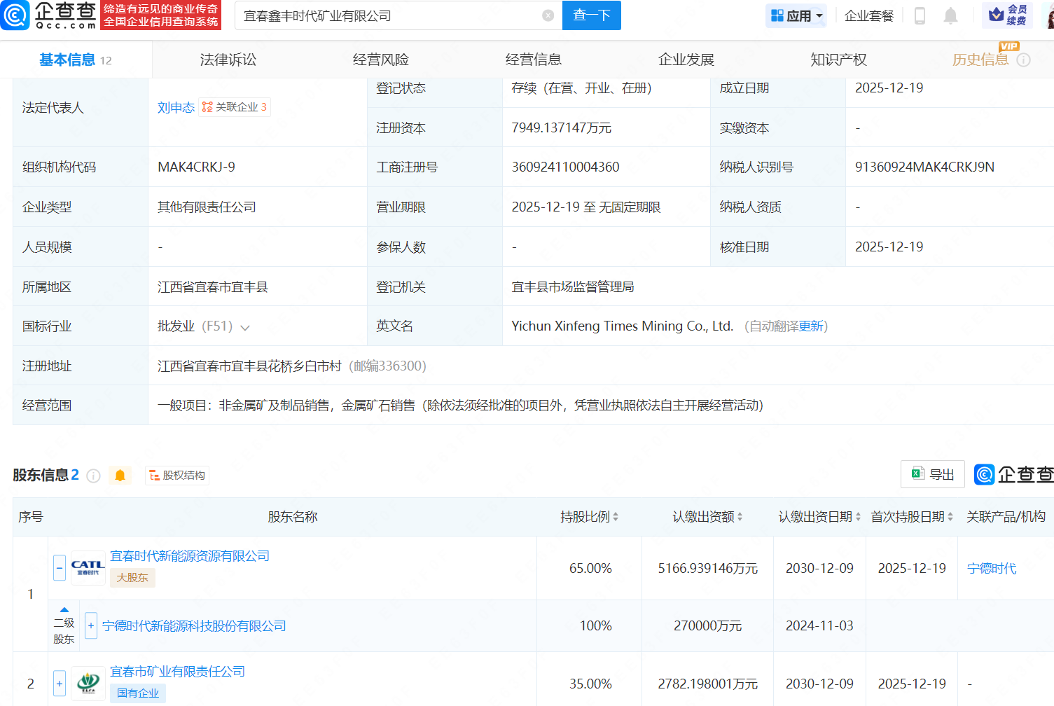 近日,宜春鑫丰时代矿业有限公司成立,法定代表人为刘申态,注册资本约7949万元,经营范围包含非金属矿及制品销售、金属矿石销售。企查查股权穿透显示,该公司由宁德时代(300750)旗下宜春时代新能源资源有限公司、宜春市矿业有限责任公司共同持股。