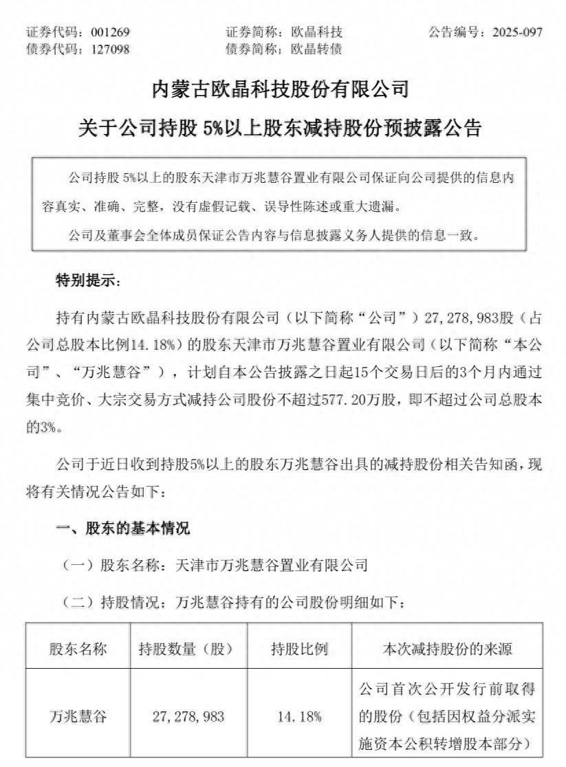 12月5日,欧晶科技(001269)发布公告,持股5%以上股东天津市万兆慧谷置业有限公司因自身经营需要牛壹佰,计划自公告之日起15个交易日后的3个月内(即2025年12月29日至2026年3月28日)通过集中竞价和大宗交易方式减持不超过577万股,约占公司总股本的3%。