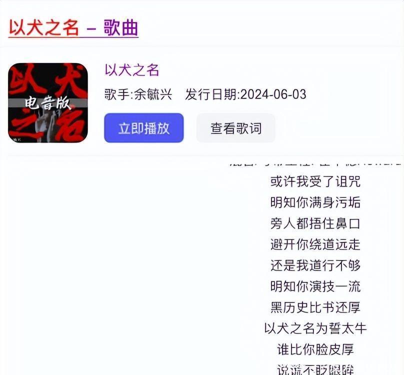 其实两人在2024年的时候就已经闹得很难看了,去年6月1日,余毓兴发售了一首名为《以犬之名》的歌曲,歌词内容就是在内涵张柏芝。