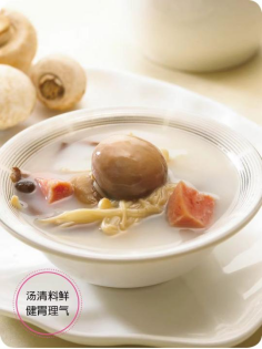 牛奶浸杂菌是一道能健胃理气的素汤。杂菌是指新鲜的草菇、金针菇、茶树菇和新鲜香菇等。食用菌有着其独特的营养,是一种高蛋白、低脂肪,且富含天然维生素和矿物质的健康食品。其最大的特点是菌香浓郁、滑嫩鲜美,中医认为其能健胃、理气、强身、抗癌。牛奶除了不含食物纤维外,几乎包含了人体所需的各种营养素,被誉为“液体黄金”。
