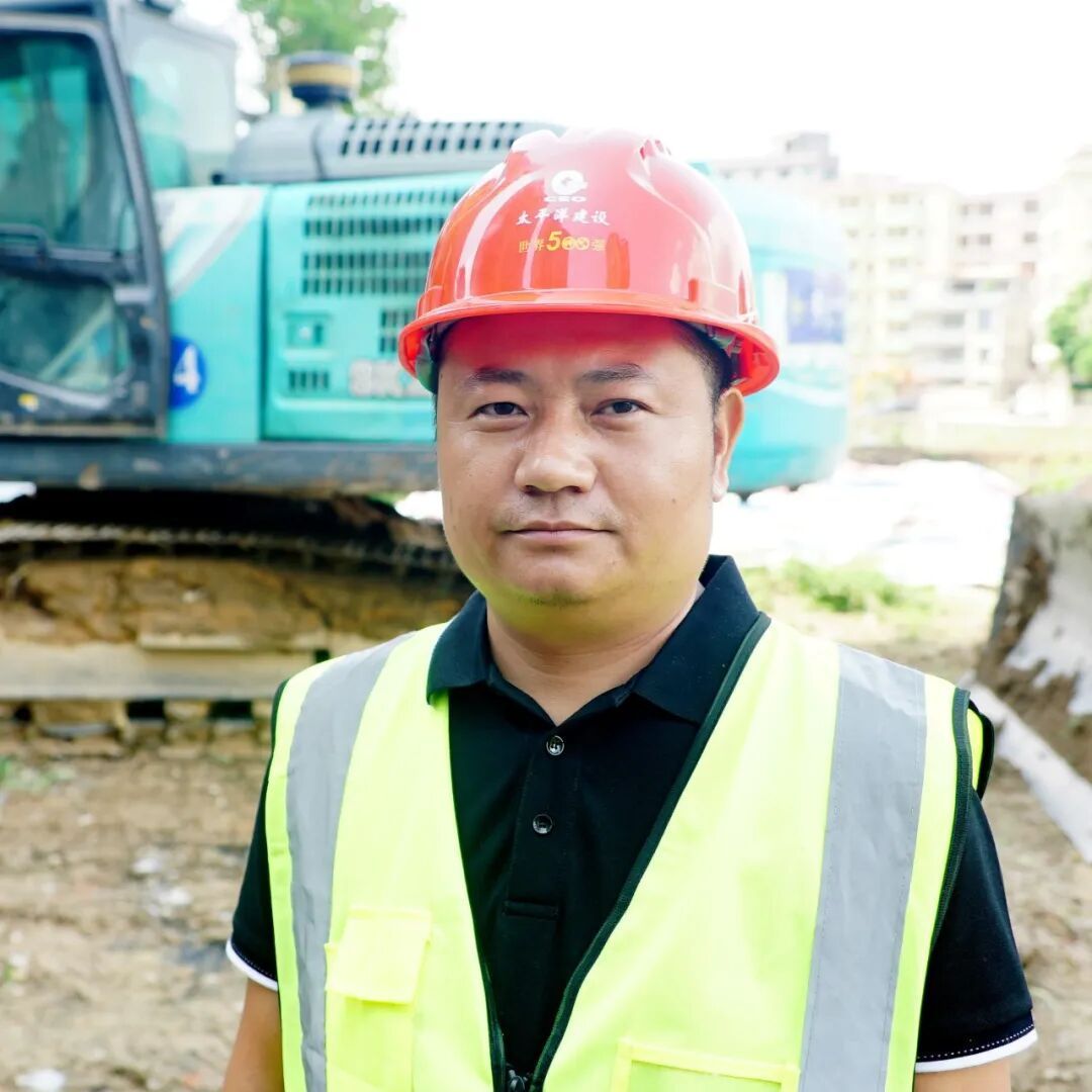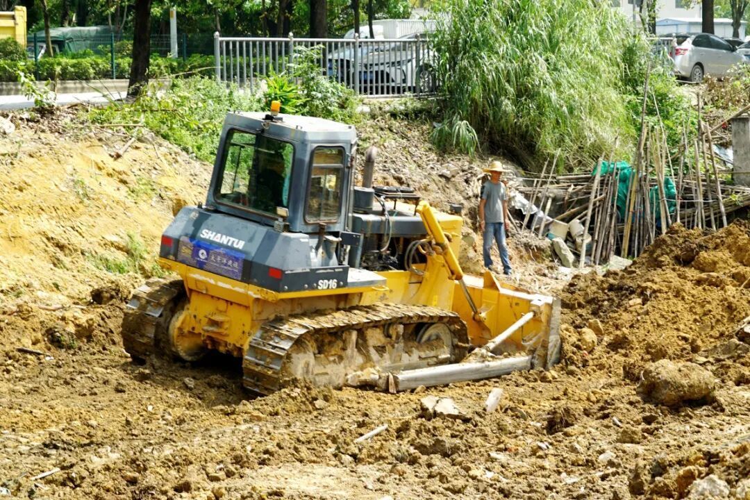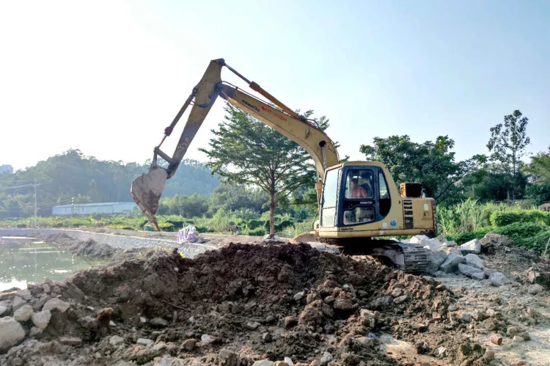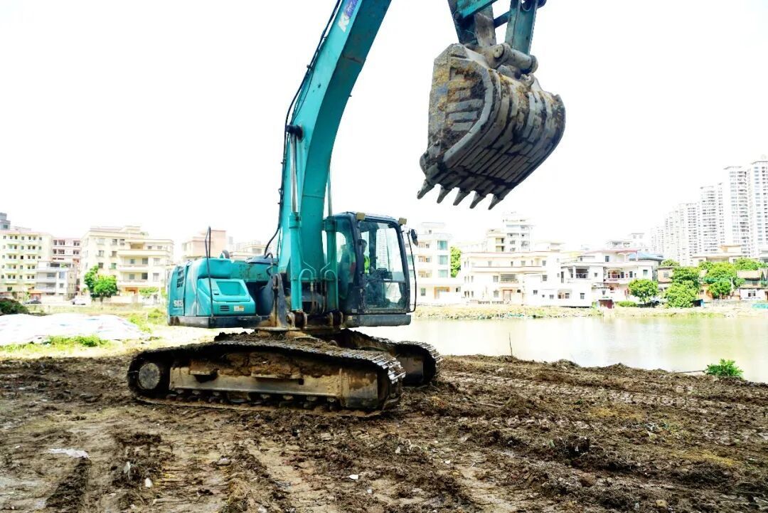 在沙坪街道楼冲村委会大兴村,挖掘机、推土机轰鸣作业,鹤山太平洋建设有限公司董事长陈浩操作机器,与员工并肩作战。